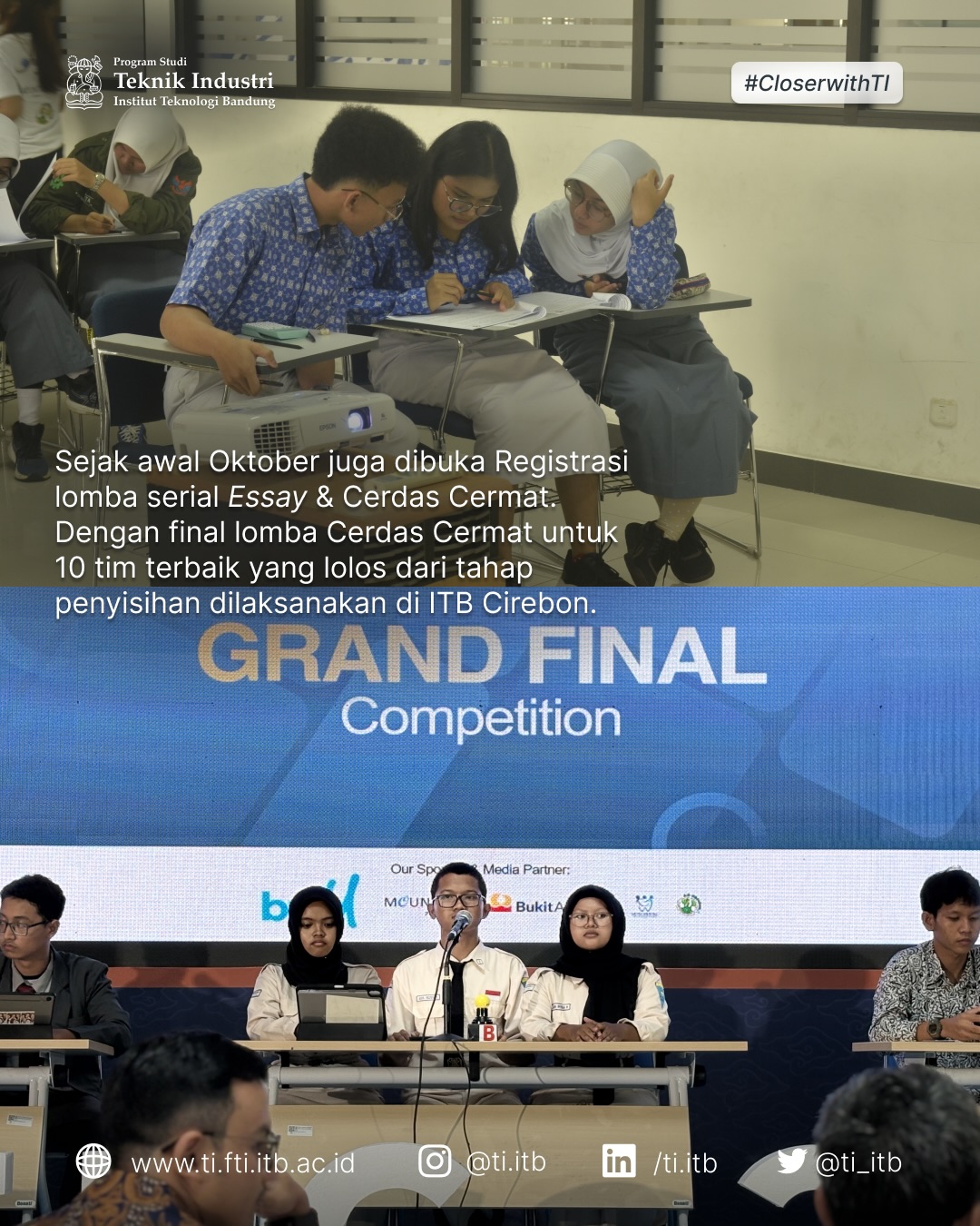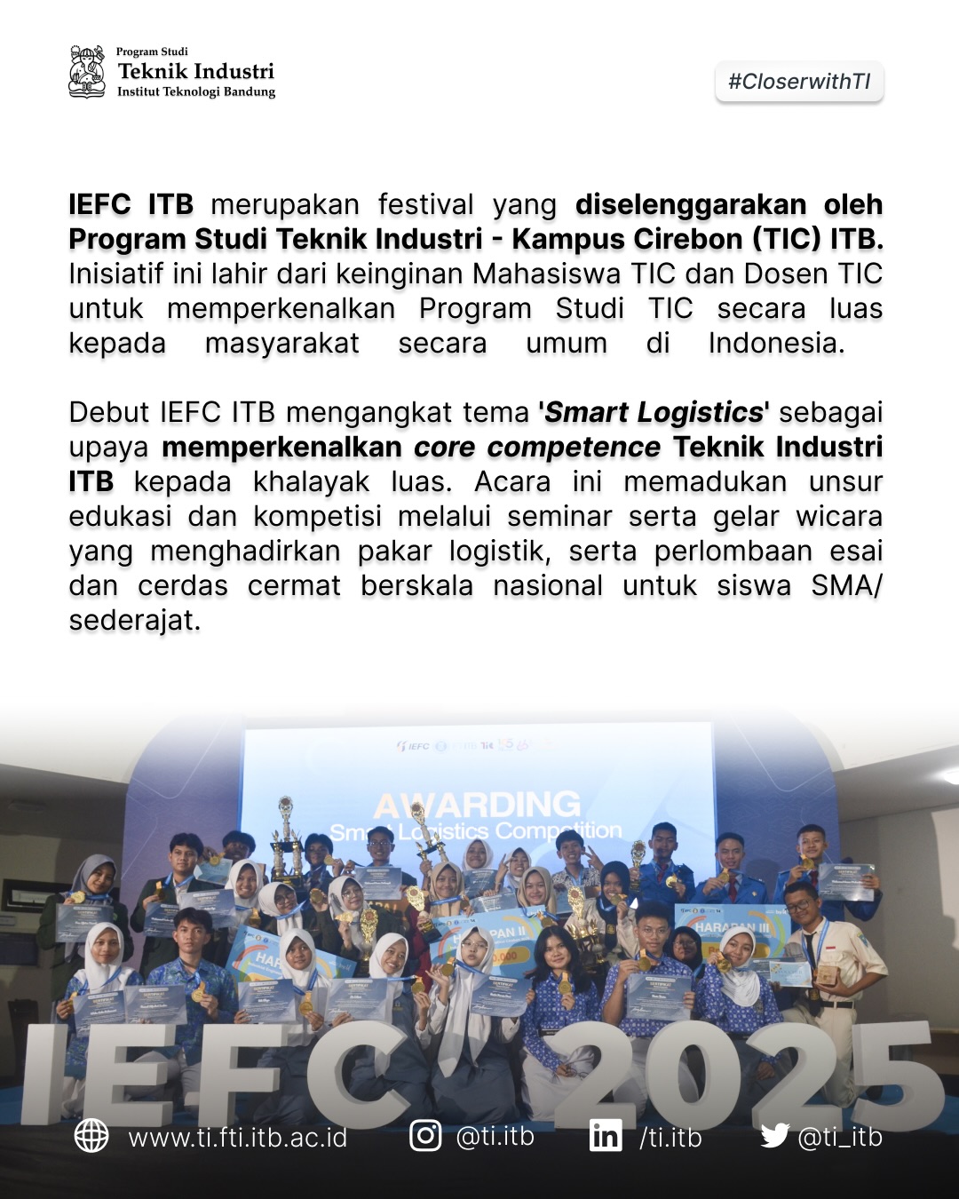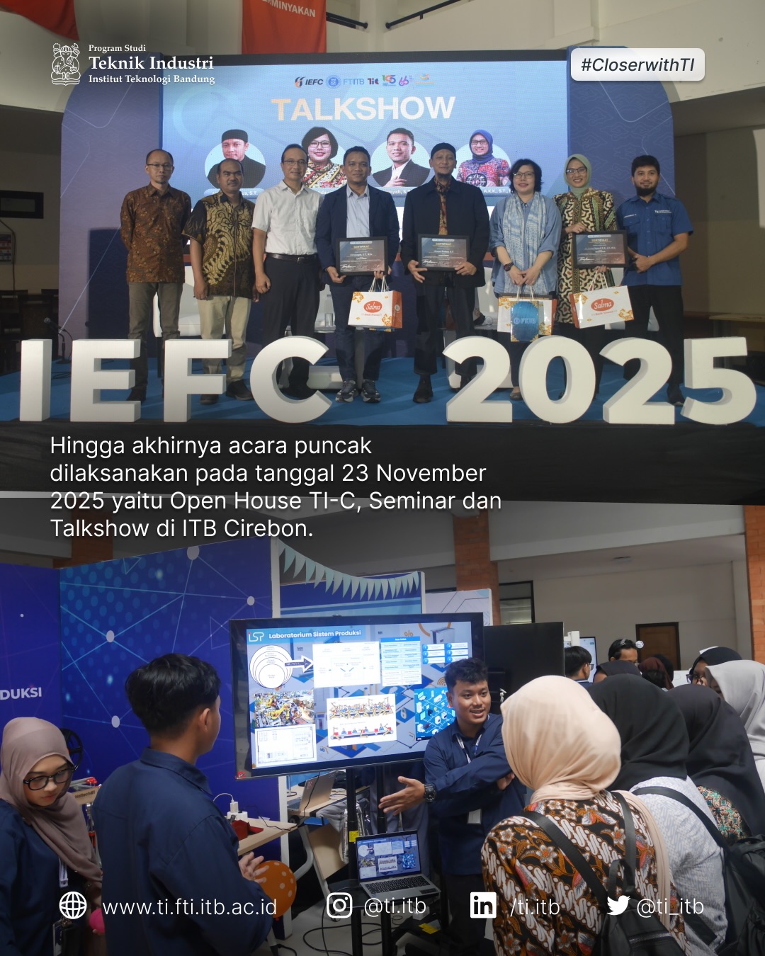 Industrial Engineering Festival Cirebon (IEFC) 2025 Posted: December 2, 2025 By: industrial-engineering Category: Berita Reviewing the Industrial Engineering Festival Cirebon (IEFC) 2025, which was held from September to November 2025 at ITB Cirebon Campus. Share Strategi Raksasa FMCG Mendulang Emas Melalui E-Commerce Jun 18, 2019 industrial-engineering Berita Mahasiswi Teknik Industri ITB menjadi Tim Pemenang dalam Kompetisi Unbox Supply Chain Hackathon at L’Oreal Mar 28, 2019 industrial-engineering Berita Sharing Mengelola Talent Millennials dari Blibli.com Mar 25, 2019 industrial-engineering Berita