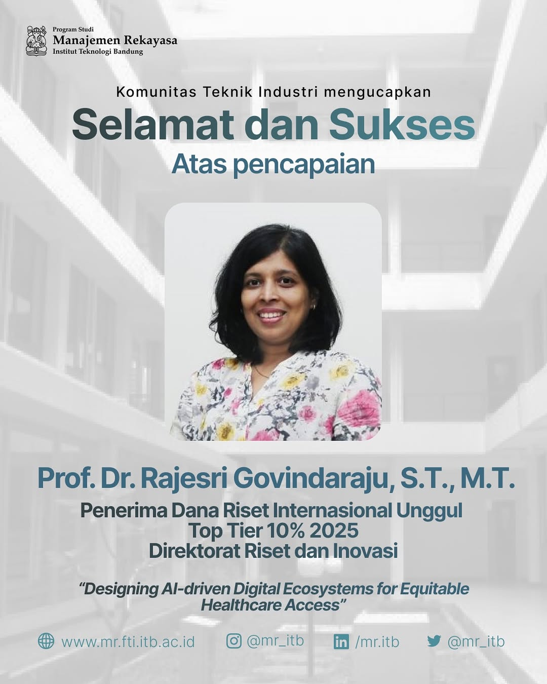 Komunitas Teknik Industri ITB mengucapkan selamat kepada Prof. Dr. Rajesri Govindaraju, S.T., M.T. atas pencapaiannya sebagai Penerima Dana Riset Internasional Unggul Top Tier 10% 2025 dari Direktorat Riset dan Inovasi ITB dengan judul riset: “Designing AI-driven Digital Ecosystems for Equitable Healthcare Access”